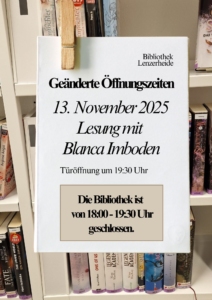 Am Donnerstag, 13. November 2025 findet die Autorenlesung mit Blanca Imboden statt. Für Vorbereitungen bleibt die Bibliothek von 18:00 – 19:30 Uhr geschlossen.